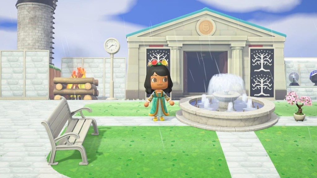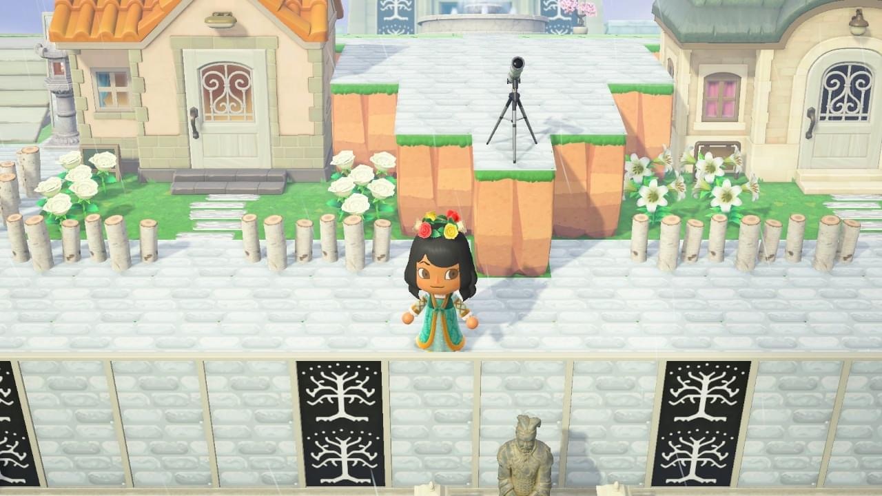 You have the Tower of Ecthelion, and of course the Beacon of Gondor. Which is LIT, just because. I tried making the courtyard with the fountain look the way it did in the movie. We also have on the right the palantir, and tons of GONDOR GEAR. I designed so much Gondor gear in ACNH – a cap, a varsity jacket, tank tops. I wish that stuff existed in real life because I would be rocking it 24/7.
